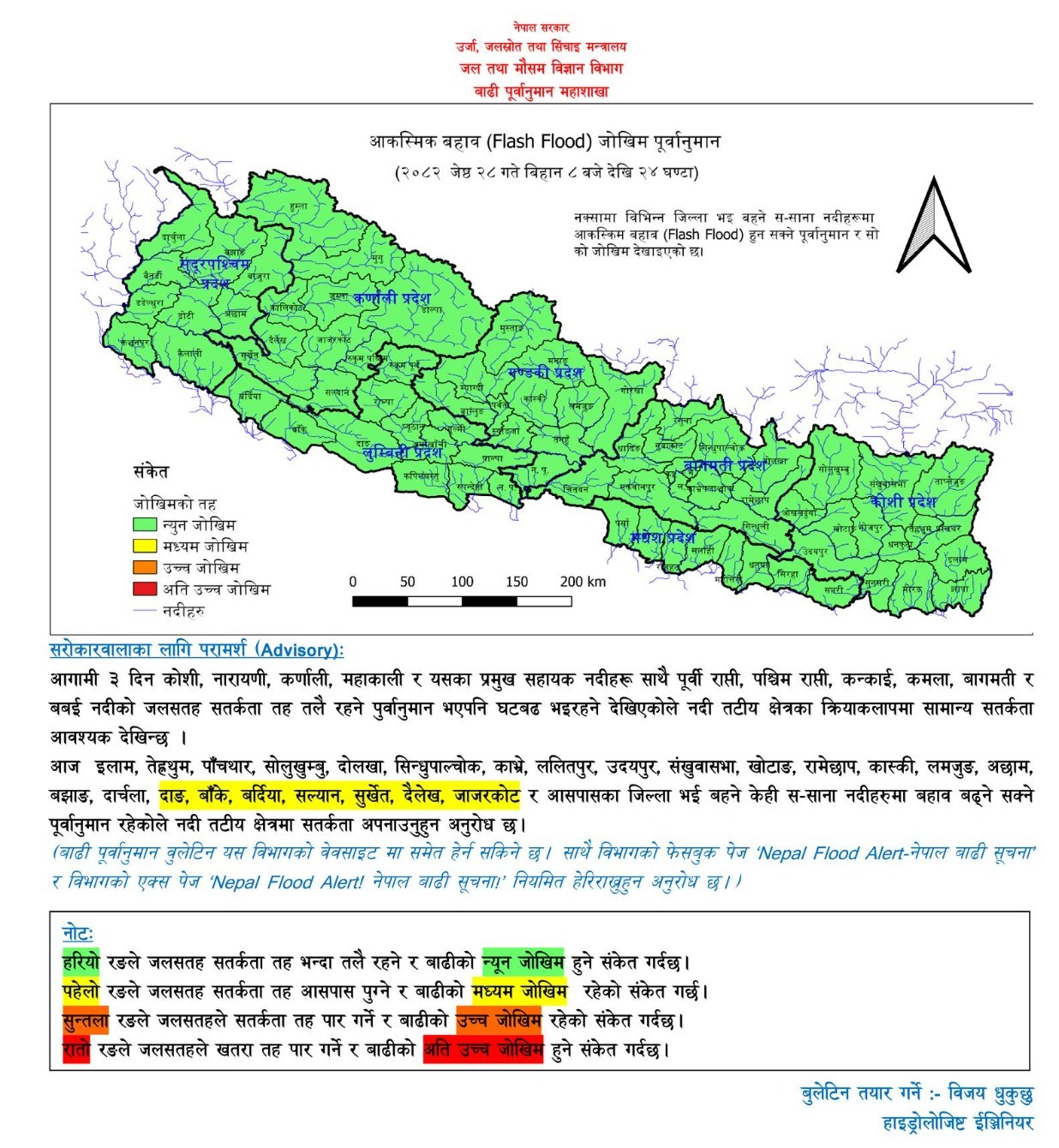 यसका साथै इलाम, तेह्रथुम, पाँचथर, सोलुखुम्बु, दोलखा, सिन्धुपाल्चोक, काभ्रे, ललितपुर, उदयपुर, संखुवासभा, खोटाङ, रामेछाप, कास्की, लमजुङ, अछाम, बझाङ र दार्चुलाका नदी तथा खोलाहरूमा पनि पानीको बहाव बढ्न सक्ने भएकाले सतर्कता अपनाउन सुझाइएको छ।