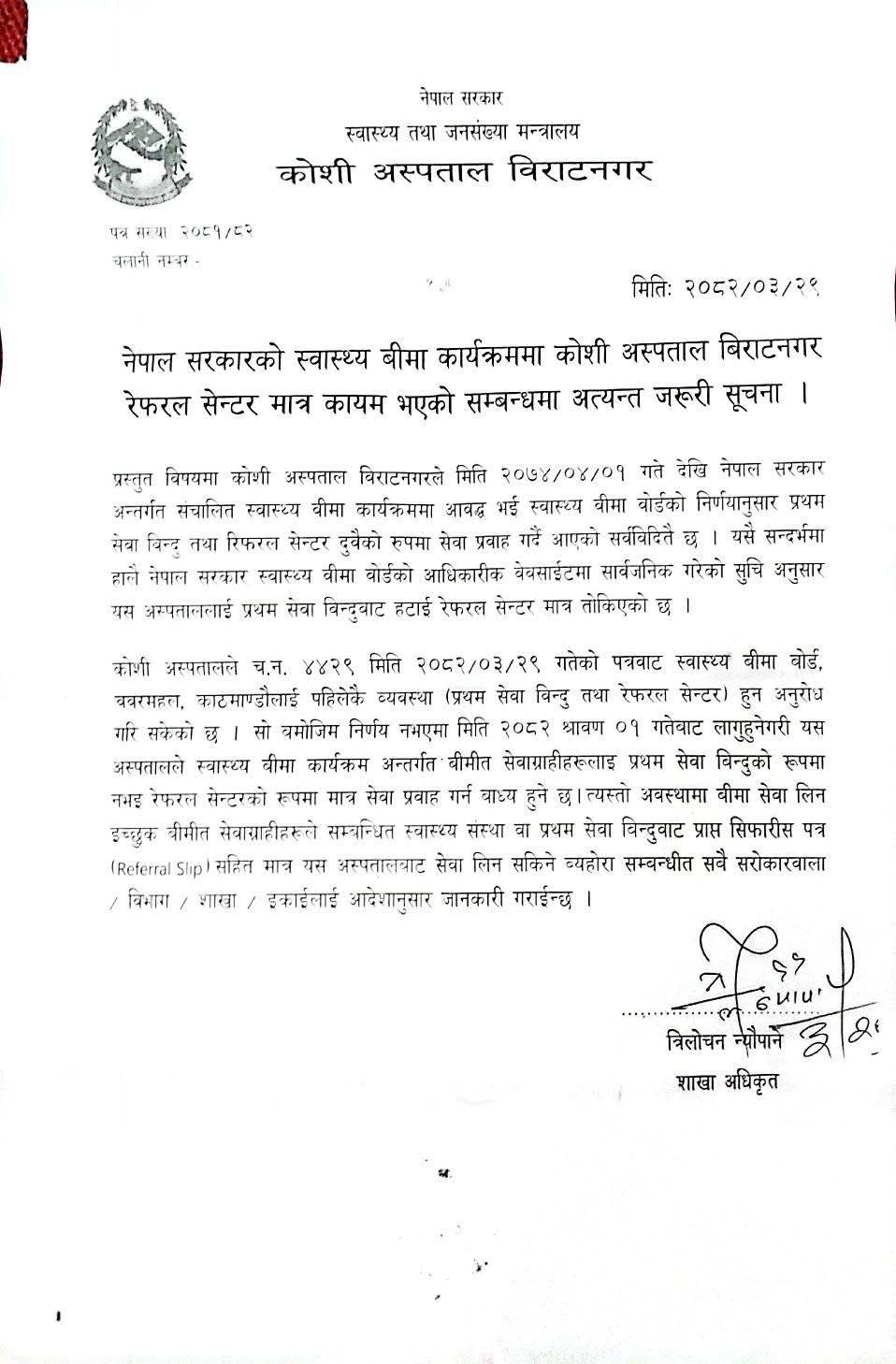 विराटनगर, ३२ अषाढ । स्वास्थ्य बीमा बोर्डको निर्णयले कोशी प्रदेशको प्रमुख सरकारी स्वास्थ्य संस्था कोशी अस्पताल संकटमा परेको छ। बीमा बोर्डले विराटनगरस्थित कोशी अस्पताललाई ‘प्रथम सेवा विन्दु’ सूचीबाट हटाएसँगै अस्पतालका चिकित्सक तथा कर्मचारी आन्दोलित भएका छन्। कोशी अस्पताल विकास समिति र कर्मचारी युनियनले सो निर्णय तत्काल फिर्ता लिन माग गर्दै चरणबद्ध आन्दोलनको चेतावनी दिएका छन्। युनियनले बुधबार मेसु डा. रुणा झामार्फत स्वास्थ्य तथा जनसंख्या मन्त्री प्रदीप पौडेललाई ज्ञापनपत्र बुझाउँदै उक्त निर्णयले अस्पतालको सेवा प्रभावकारिता, बिरामीको पहुँच र जनसाधारणको अधिकारमाथि गम्भीर असर पारेको जनाएको छ। ज्ञापनपत्रमा उल्लेख अनुसार, कोशी अस्पतालमा दैनिक झण्डै ५०० बिरामी आउँछन्, जसमध्ये ७० प्रतिशतभन्दा बढी स्थानीय हुन्। बीमा बोर्डको असार १९ गतेको निर्णयअनुसार साउन १ गतेदेखि अस्पताललाई बीमा सेवाको प्रवेशद्वारबाट हटाइएको छ। जसले गर्दा अब बिरामीहरू अन्य वडाबाट रेफर लिएर मात्र कोशी अस्पतालमा सेवा लिन सक्ने छन्। ‘प्रथम सेवा विन्दु नरहेपछि न बिरामीको नाम दर्ता भइरहेको छ, न बीमा सेवा उपलब्ध भइरहेको छ,’ ज्ञापनपत्रमा भनिएको छ, ‘यसले आकस्मिक सेवा, नियमित ओपीडी, शल्यक्रिया, भर्ना लगायत सम्पूर्ण सेवा प्रभावित भएको छ।’ युनियनले यस्तो निर्णयले मात्र बिरामी हैन, अस्पताल प्रशासन, चिकित्सक, नर्स तथा कर्मचारी सबैलाई कार्य सम्पादनमा गम्भीर असहजता बनाएको जनाएको छ। स्वास्थ्य मन्त्रालयले कर्मचारीलाई अनिवार्य बीमामा समावेश गरिसकेको अवस्थामा स्वयं अस्पतालका कर्मचारीहरू नै बीमा सुविधाबाट वञ्चित हुने अवस्था आएको युनियनको दाबी छ। कर्मचारी युनियनले सो निर्णयलाई निजीकरण प्रवृत्तिसँग जोड्दै केही निजी अस्पतालहरूलाई लाभ पुर्याउने नियोजित प्रयास भएको आशंका व्यक्त गरेको छ। अध्यक्ष डा. रोशन खड्काले भन्नुभयो, रेफरल प्रणालीमार्फत बीमित बिरामीलाई निजी अस्पतालमा डोर्याउने र सार्वजनिक स्वास्थ्य संस्थालाई पन्छ्याउने योजना हामीलाई स्वीकार्य छैन। यदि सरकारको निर्णय तत्काल सच्याइएन भने अस्पताल भित्र समस्या चर्कने र आन्दोलन अपरिहार्य हुने चेतावनी समेत युनियनले दिएको छ।