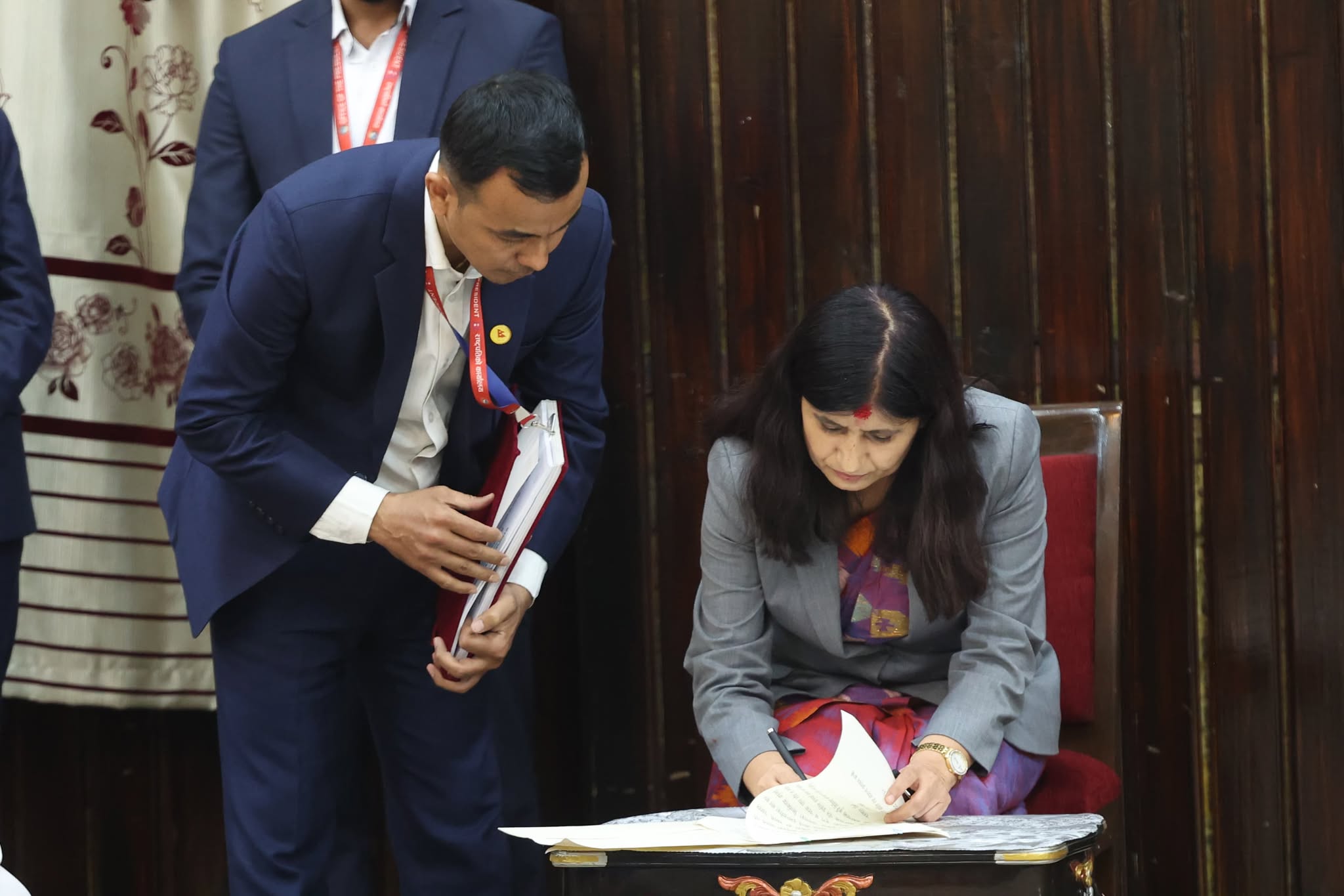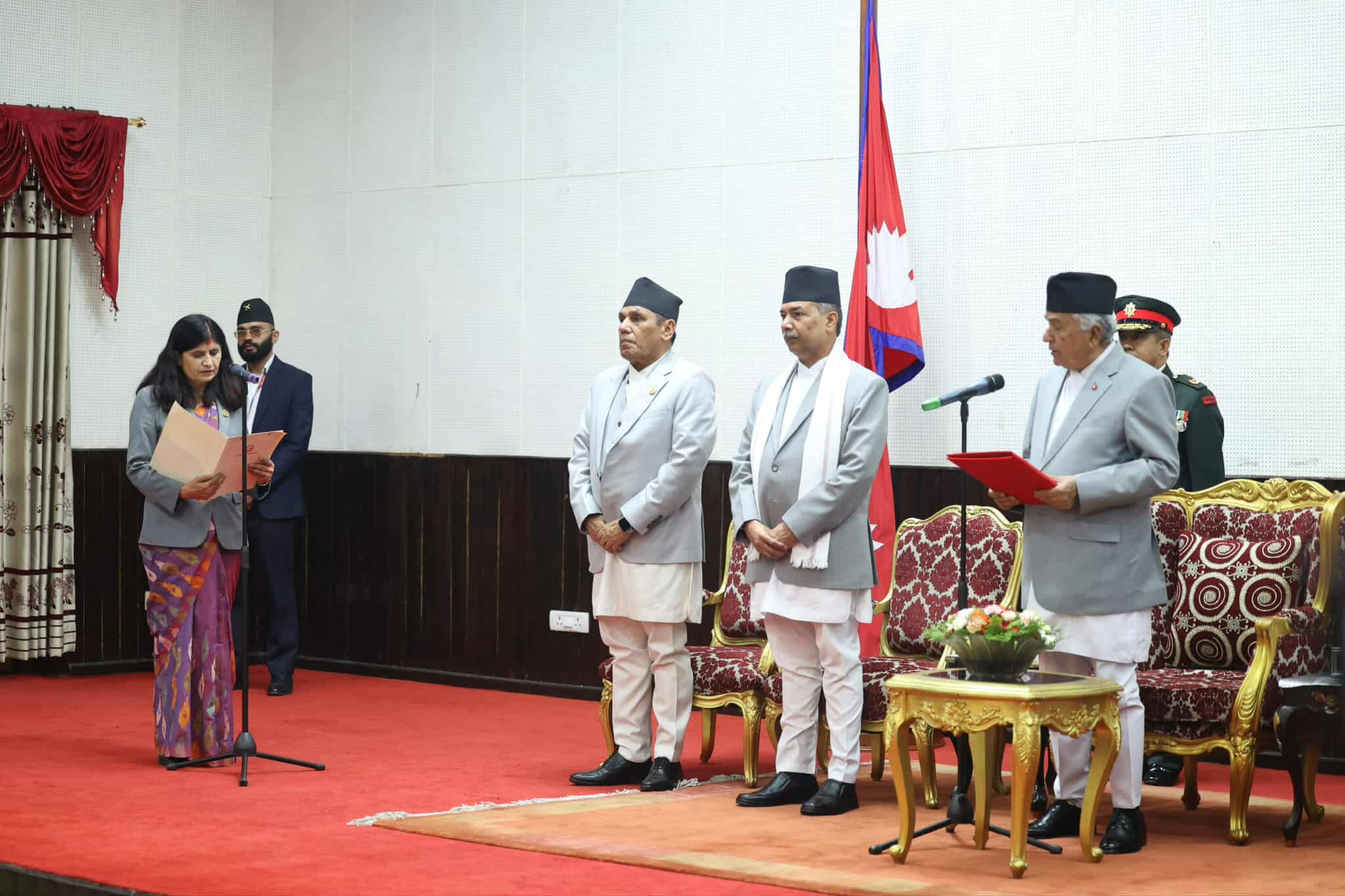 काठमाडौं, ३२ अषाढ । नवनियुक्त संघीय मामिला तथा सामान्य प्रशासन मन्त्री मन्त्री भगवती न्यौपानेले शपथ ग्रहण गर्नुभएको छ । बुधबार शीतल निवासमा आयोजित समारोहमा प्रधानमन्त्री केपी शर्मा ओलीको उपस्थितिमा राष्ट्रपति रामचन्द्र पौडेलले न्यौपानेलाई शपथ ग्रहण गराउनु भएको हो । उहाँले शपथ पछि कार्यभार पनि सम्हालनु भएको छ। घुस डिलको अडिओ प्रकरणपछि प्रधानमन्त्रीको निर्देशनमा राजकुमार गुप्ताले पदबाट राजीनामा दिएपछि न्यौपान मन्त्री नियुक्त हुनु भएको हो । मन्त्री न्यौपाने राष्ट्रिय सभा सदस्य हुनुहुन्छ । तनहुँकी न्यौपानेको राष्ट्रिय सभा सदस्य पद ६ वर्षे कार्यकाल पुरा गरेर आगामी फागुनमा सकिँदैछ । राष्ट्रिय सभामा एमालेको प्रमुख सचेतक रहनु भएकी न्यौपाने २०७४ को स्थानीय निर्वाचनमा तनहुँको भानु नगरपालिकाको मेयरमा पराजित बन्नुभएको थियो । उहाँ त्यसवेला ९ हजार ६४ मत पाएपनि कांग्रेसका उदयराज गौलीसँग पराजित हुनु भएको थियो । २०७६ मा भने उहाँ राष्ट्रियसभामा निर्वाचित हुनु भएको थियो ।