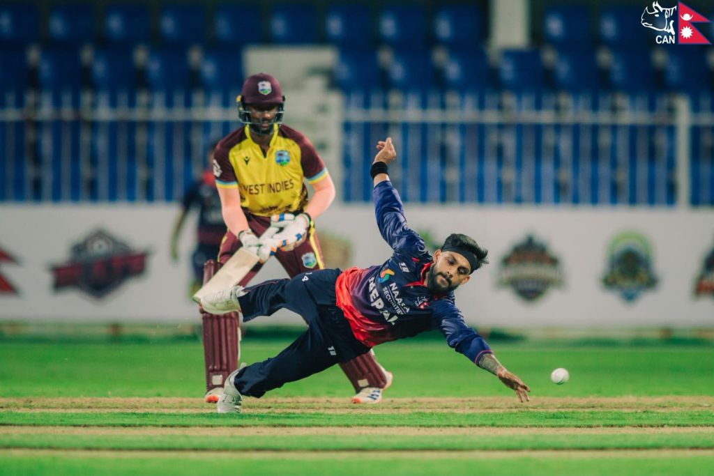 गएरातिको खेलमा नेपालले दिएको एक सय ७४ रनको लक्ष्य पछ्याएको वेस्ट इन्डिज ८३ रनमा अलआउट भयो । वेस्ट इन्डिज १७ दशमलव एक ओभरमा सबै विकेट गुमाउदै ८३ रनमा समेटियो । वेस्ट इन्डिजका लागि जेसन होल्डरले सर्वाधिक २१ रन बनाए । उनले १५ बलमा दुई छक्कासहित सर्वाधिक २१ रन बनाए । यस्तै, एकिम अगष्टले १७ तथा अमिर जांगोले १६ रन जोडे । नेपालकालागि आदिल आलमले ४ विकेट लिए । यस्तै, कुशल भुर्तेलले तीन तथा ललित राजवंशी र दीपेन्द्रसिंह ऐरीले १–१ विकेट लिए ।
