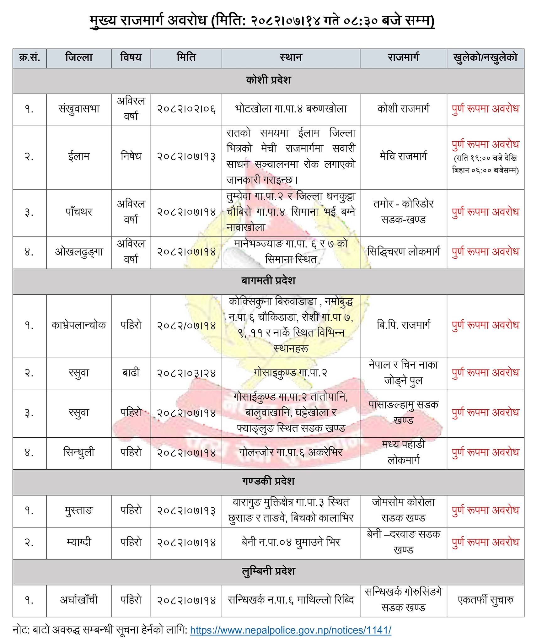 जल तथा मौसम विज्ञान विभाग एवं राष्ट्रिय विपद् जोखिम न्यूनीकरण तथा व्यवस्थापन प्राधिकरणको सूचना अनुसार बङ्गालको खाडीमा विकसित चक्रवत ‘मोन्था’का कारण कोशी प्रदेशका धेरै स्थानमा अत्यधिक वर्षा भई विपद्जन्य घटना घट्न सक्ने कुरालाई मध्यनजर गर्दै मेची राजमार्गमा रातको समयमा सवारी सञ्चालनमा रोक लगाइएको छ । यो राजमार्गको इलाम खण्ड भने पहिरोका कारण अवरुद्ध छ । सङ्खुवासभाको भोटखोला–४ बरुणखोला स्थित कोशी राजमार्ग गत जेठदेखि नै अबरुद्ध छ । बरुणखोलामा बाढी आई ह्युम पाइप बगाएको हुँदा खाँदबारी देखि थुमसुर जाने कोशी राजमार्ग पूर्ण रूपमा अवरोध भएको हो । रुकुम पूर्व मध्यपहाडी लोकमार्ग निर्माण कार्य अवधिसम्मको लागि पूर्णरुपमा बन्द रहेको छ । मुस्ताङ वारागुङ मुक्तिक्षेत्रको जोमसोम कोरोला सडक खण्ड स्थित छुसाङ र ताङवे, बिच कालाभिर स्थित बाटो अवरोध लेदोसहितको पहिरोका कारण पूर्ण रूपमा अवरुद्ध छ । यता म्याग्दी बेनी–०४ घुमाउने भिर स्थित बेनी –दरवाङ सडक खण्ड पहिरोका कारण पूर्ण रूपमा अवरुद्ध छ । बीपी राजमार्गको विभिन्न स्थानमा पनि सडक अवरुद्ध छ । पाँचथरको तुम्वेवा–२ र धनकुट्टाको चौबिसे –४ सिमाना स्थित तमोर–कोरिडोर सडकखण्ड बाढीका कारण अबरुद्ध छ । ओखलढुङ्गा मानेभञ्ज्याङ गाउँपालिका ०६ र ०७ को सिमाना स्थित सिद्धिचरण लोकमार्ग, रसुवाको पासाङल्हामु सडक खण्डमा विभिन्न स्थान, सिन्धुलीको गोलन्जोर–६ अकरेभिर स्थित मध्य पहाडी लोकमार्ग पूर्ण रूपमा अवरुद्ध रहेको छ । पाँचथरको याङवरक–३ मध्य पहाडी लोकमार्ग, रामेछापको खाँडादेवी–१ खैरेनीघाट स्थित मध्य पहाडी लोकमार्ग पूर्ण रूपमा अवरुद्ध रहेको छ । चितवनको मुग्लिन–नारायणगढ सडकखण्डअन्तर्गत तुइन खोला पुलनजिक बाटोमा सवारीसाधन सञ्चालनमा ल्याइएको छ । शुक्रबार बिहान उक्त स्थानमा ढुंगा खस्दा सवारी आवागमन अवरुद्ध भएको थियो । ढुंगा झर्ने क्रम रोकिएसँगै सवारीसाधन सञ्चालनमा ल्याइएको सडक डिभिजन भरतपुरले जनाएको छ । “मुग्लिन नारायणगढ सडकखण्डको तुइन खोला पुलनजिकै माथिबाट ढुंगाहरू झर्दा सवारी आवागमन अवरुद्ध भएको सडक अहिले सञ्चालनमा आएको छ,” सडक डिभिजनले शुक्रबार बिहान सवा ९ बजे जारी गरेको सूचनामा उल्लेख छ, “ढुंगाहरू झर्ने क्रम रोकिएकोले मेसिनको प्रयोग गरी पहिरो हटाउने कार्य सुचारु भइरहेको छ ।” वर्षाको समयमा यो क्षेत्रमा पहिरोको उच्च जोखिम हुने भएकाले बाटोको अवस्था बुझेर मात्र यात्रा गर्न सडक डिभिजनले आग्रह गरेको छ । चितवनको इच्छाकामना गाउँपालिका–५ मा पर्ने उक्त क्षेत्रमा यसअघि पहिरोका कारण लामो समय सडक अवरुद्ध भएको थियो ।