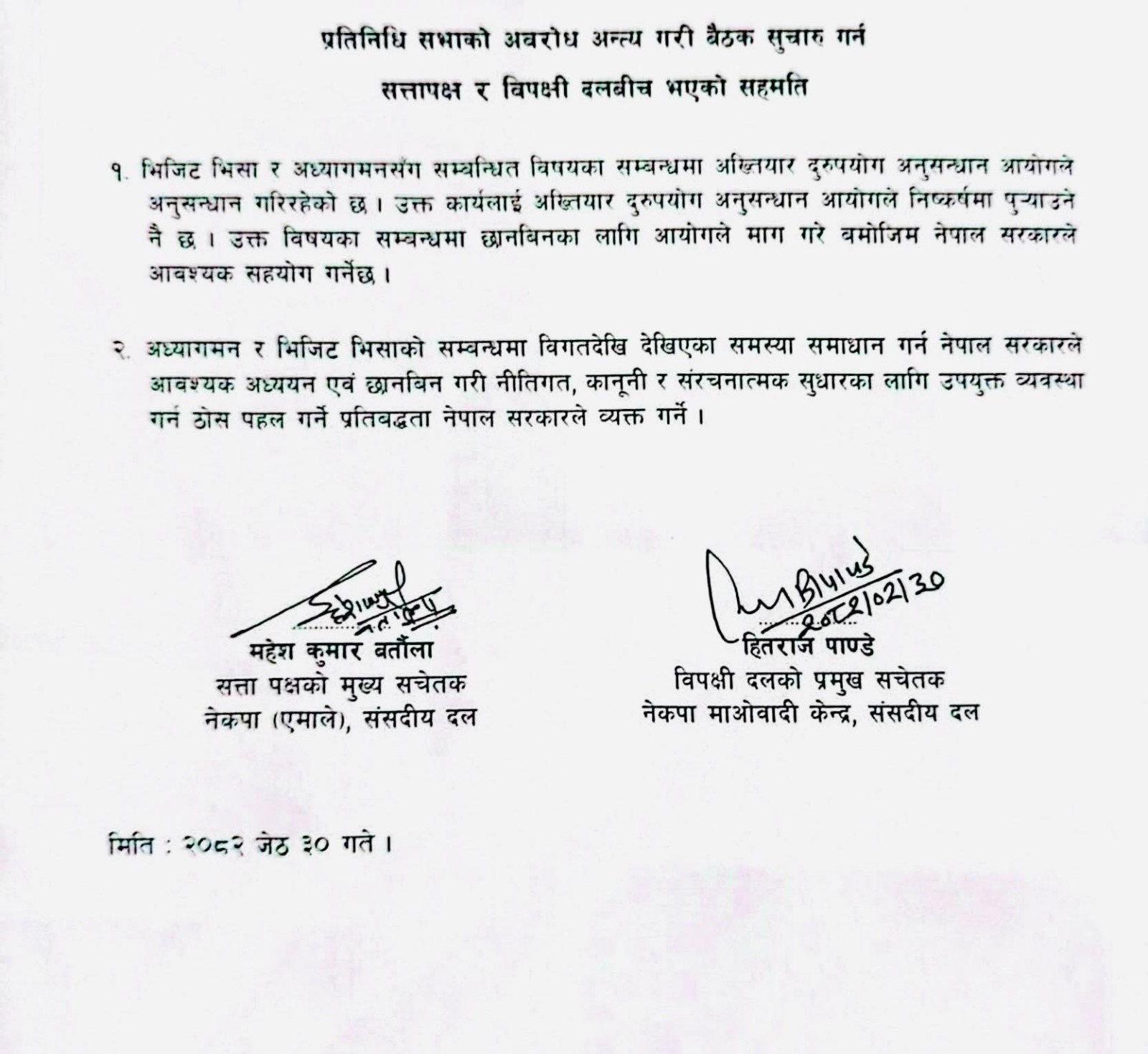 सहमति पत्रमा सत्तापक्षका तर्फबाट एमालेका मुख्य सचेतक महेश बर्तौला र प्रतिपक्षका तर्फबाट माओवादीका प्रमुख सचेतक हितराज पाण्डेले हस्ताक्षर गरेका छन्।