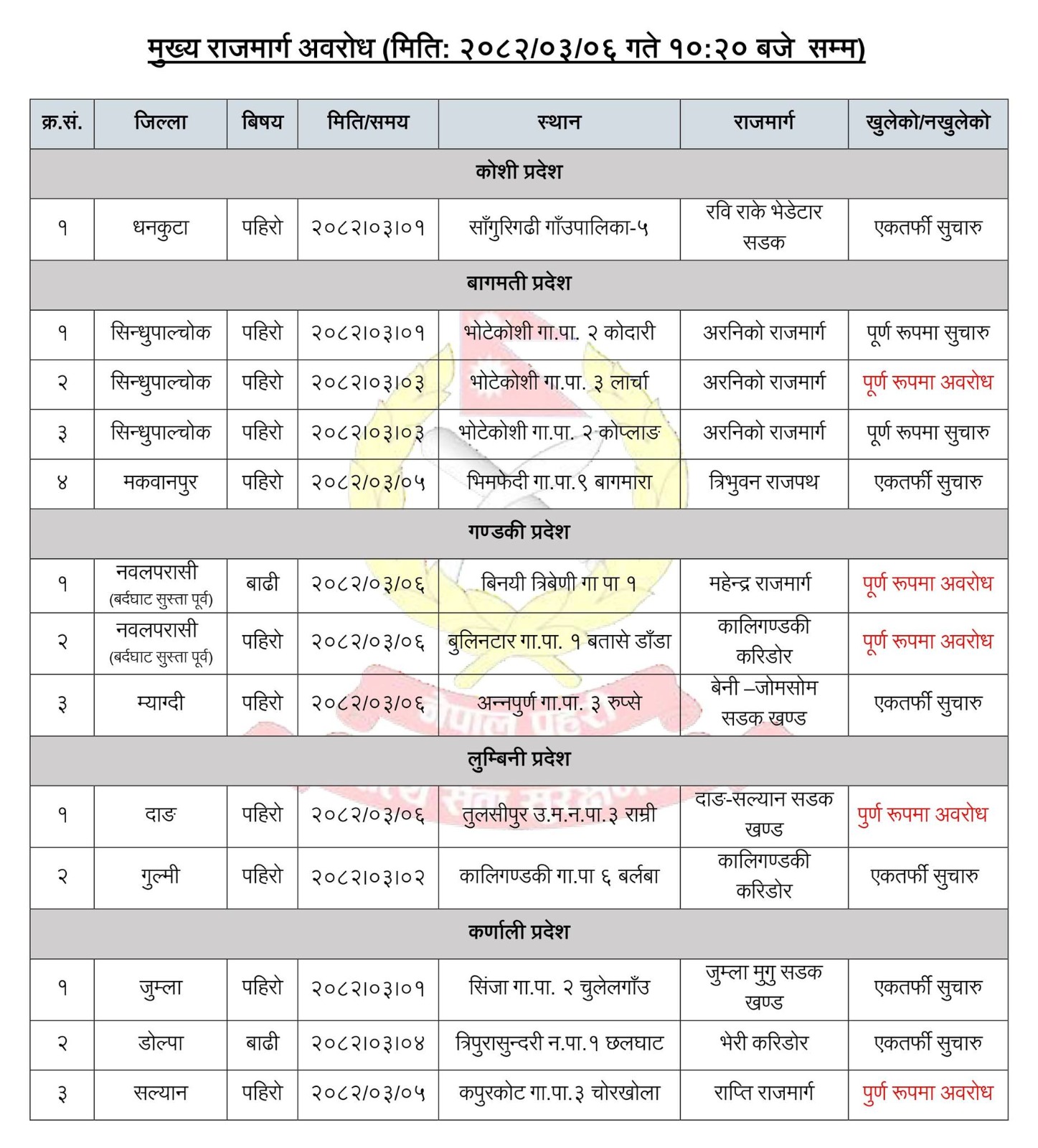 बाढी पूर्वानुमान महाशाखाले आज देशका ५६ जिल्लामा बाढीको जोखिम रहेको जनाएको छ। कोशी, नारायणी, कर्णाली, महाकाली र बबईजस्ता प्रमुख नदीहरूको जलसतह बढ्दो क्रममा रहेकाले तटीय क्षेत्रमा उच्च सतर्कता अपनाउन आग्रह गरिएको छ। संखुवासभा, गोरखा, लमजुङ, कास्की, बागलुङ, बाँके, बर्दिया, दाङ, कैलाली, कञ्चनपुर, डोटी र डडेलधुरासहित २२ जिल्लामा आकस्मिक बाढीको मध्यम जोखिम रहेको भन्दै ‘एल्लो अलर्ट’ जारी गरिएको छ।बाढी र पहिरोका कारण देशभरको सडक सञ्जाल नराम्ररी प्रभावित भएको छ। सडक विभागका अनुसार अर्घाखाँचीको सालझण्डी सन्धीखर्क, सल्यानको राप्ती राजमार्ग, सिन्धुपाल्चोकको अरनिको राजमार्ग र गुल्मीको तानसेन रिडीकोरला सडक लगायत ६ वटा सडक खण्ड पूर्ण रूपमा बन्द छन्। यस्तै देशभरका ४१ वटा अन्य सडकहरू एकतर्फी मात्र सञ्चालनमा छन्। अन्त्यमा, मनसुन पश्चिममा केन्द्रित भएसँगै त्यस क्षेत्रमा बाढी र पहिरोको जोखिम उच्च देखिएको छ। सम्बन्धित निकायले सबैलाई आवश्यक सावधानी अपनाउन, जोखिमपूर्ण यात्रा नगर्न र नदी तटीय क्षेत्रबाट टाढा रहन आग्रह गरेको छ।