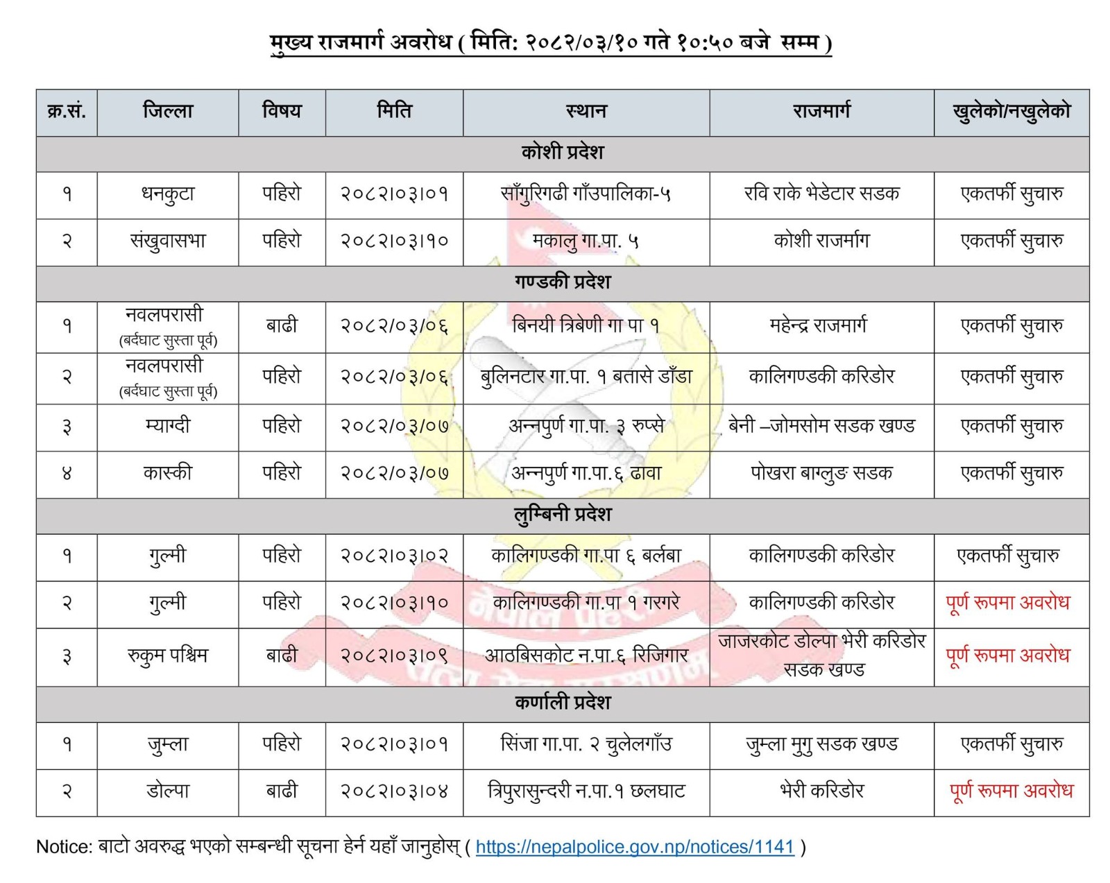 नेपाल प्रहरीका अनुसार तीनवटा राष्ट्रिय करिडोरसहित ११ वटा सडक खण्ड अवरुद्ध भएका छन् भने जल तथा मौसम विज्ञान विभागले ५५ जिल्लामा बाढीको जोखिम रहेको भन्दै उच्च सतर्कता अपनाउन आग्रह गरेको छ। नेपाल प्रहरीले आज बिहान सार्वजनिक गरेको विवरणअनुसार देशभरका मुख्य सडकहरूको अवस्था निम्नानुसार छः