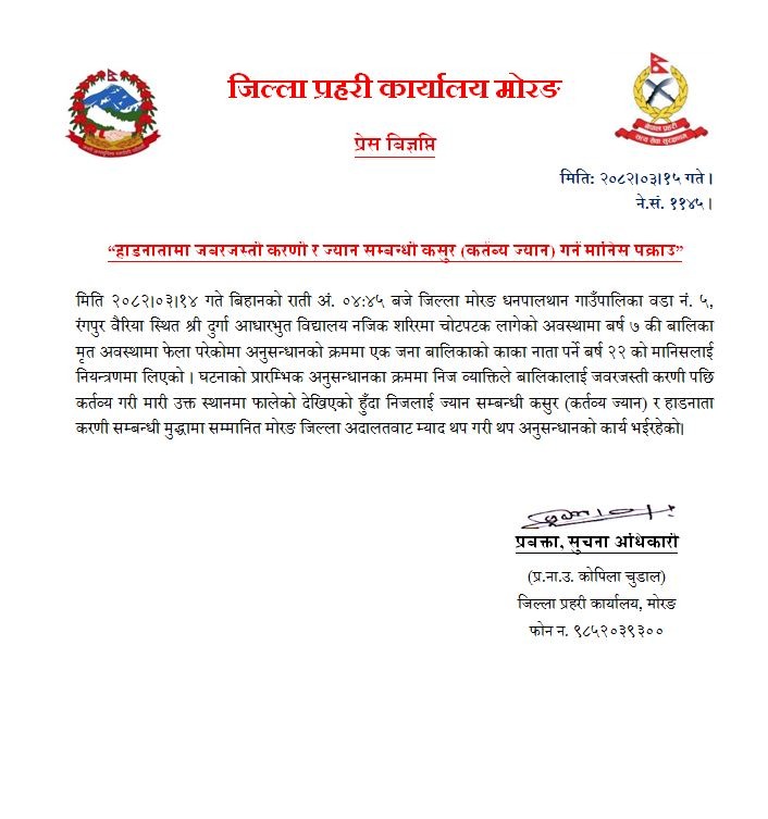 विराटनगर, १५ आषाढ । मोरङको धनपालथान गाउँपालिकामा मानवतालाई नै स्तब्ध बनाउने एक दर्दनाक घटना सार्वजनिक भएको छ, जहाँ एक ७ वर्षीया बालिकाको उनकै काकाले बलात्कारपछि हत्या गरेको प्रहरीले दाबी गरेको छ ।