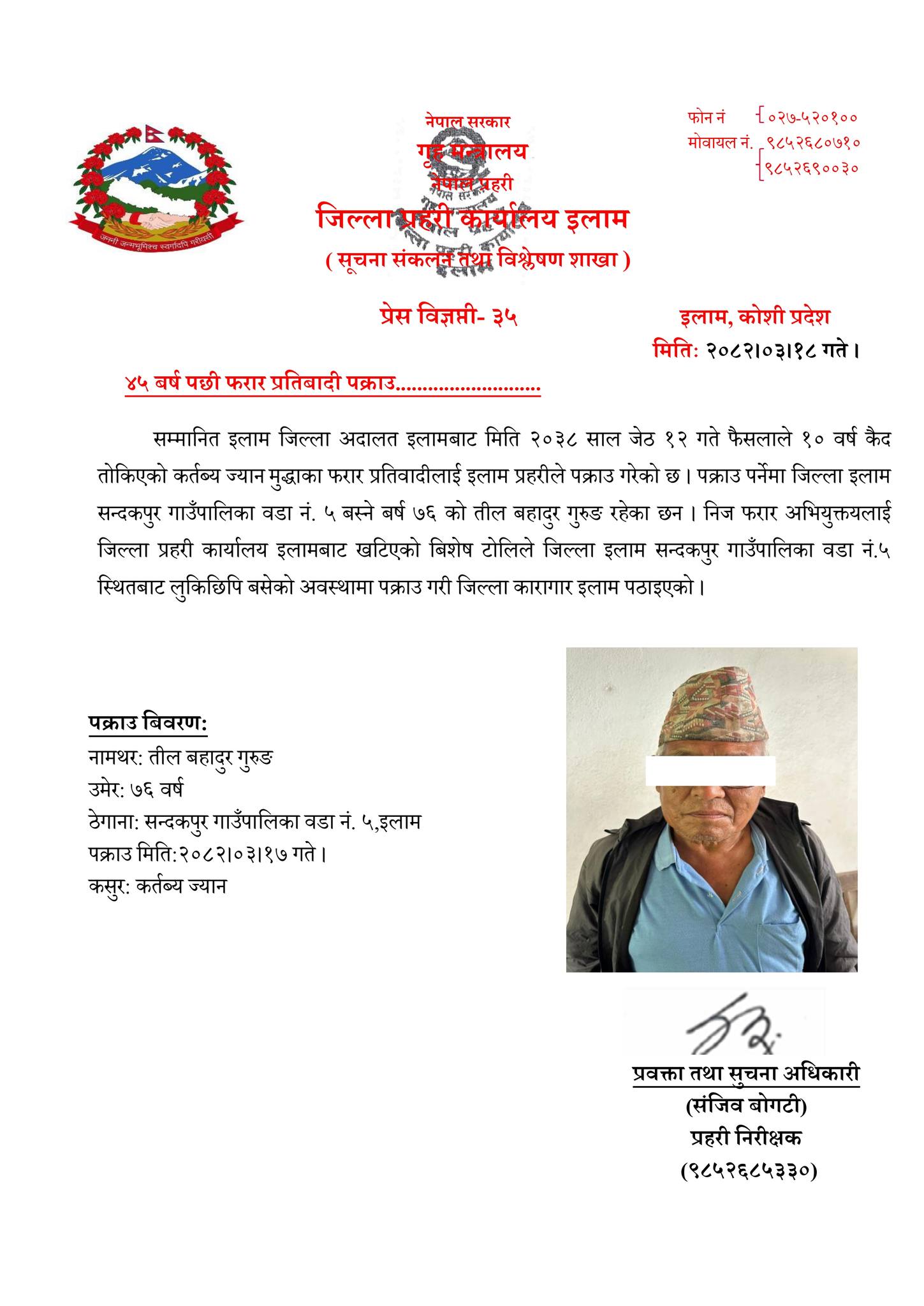 इलाम,अषाढ १८। कानुनको आँखाबाट कोही पनि उम्कन सक्दैन, भन्ने भनाइलाई चरितार्थ गर्दै इलाम प्रहरीले कर्तव्य ज्यान मुद्दामा ४५ वर्षदेखि फरार रहेका एक ७६ वर्षीय वृद्धलाई पक्राउ गरी कारागार चलान गरेको छ। जिल्ला अदालत इलामले २०३८ सालमै १० वर्ष कैद सजाय सुनाएका सन्दकपुर गाउँपालिका–५ का टील बहादुर गुरुङलाई प्रहरीले उनकै गाउँबाट पक्राउ गरेको हो। जिल्ला प्रहरी कार्यालय इलामका प्रवक्ता तथा सूचना अधिकारी, प्रहरी निरीक्षक सञ्जीव बोगटीका अनुसार, अदालतको फैसलापछि लामो समयदेखि फरार रहेका गुरुङ गाउँघरमै लुकिछिपी बसेको भन्ने विशेष सूचनाको आधारमा प्रहरीको एक विशेष टोली खटाइएको थियो। उक्त टोलीले २०८१ असार १७ गते गुरुङलाई पक्राउ गर्न सफल भयो।