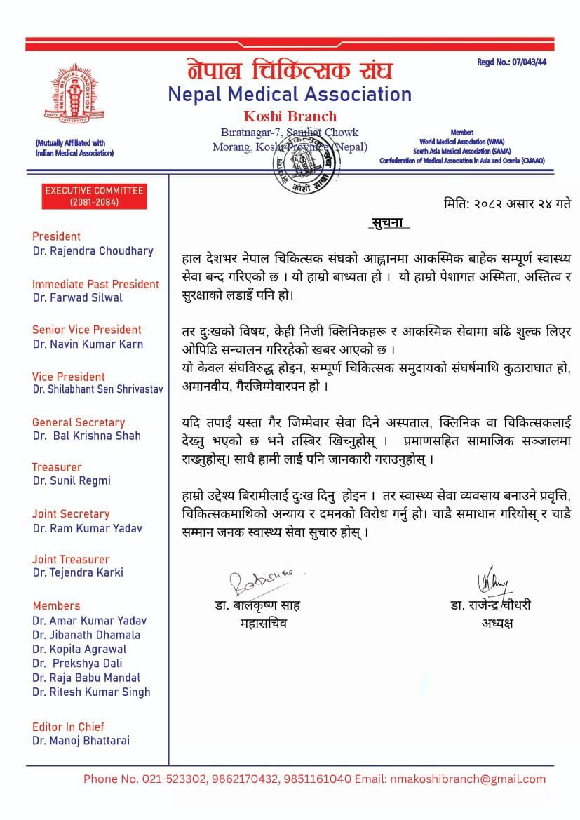 विराटनगर, २४ अषाढ । देशभरका चिकित्सकहरू आफ्नो पेशागत सुरक्षाको माग गर्दै आन्दोलनमा उत्रिएका बेला नेपाल चिकित्सक संघ, कोशी शाखाले आन्दोलन विपरीत सेवा सञ्चालन गर्ने र बिरामीसँग बढी शुल्क असुल्ने निजी क्लिनिक तथा चिकित्सकहरूको पहिचान गरी भण्डाफोर गर्न आम सर्वसाधारणलाई अपिल गरेको छ। संघले एक सूचना जारी गर्दै राष्ट्रव्यापी आन्दोलनको मर्म विपरीत केही निजी क्लिनिकहरूले ओपिडी सञ्चालन गरिरहेको र आकस्मिक सेवामा समेत बढी शुल्क लिइरहेको खबर आएकोमा गम्भीर ध्यानाकर्षण भएको जनाएको छ। संघका अध्यक्ष डा. राजेन्द्र चौधरी र महासचिव डा. बालकृष्ण साहद्वारा हस्ताक्षरित विज्ञप्तिमा यस्तो कार्य केवल संघको निर्णय विरुद्ध मात्र नभई सम्पूर्ण चिकित्सक समुदायको संघर्षमाथि गरिएको कुठाराघात भएको उल्लेख छ। विज्ञप्तिमा भनिएको छ, “यो केवल संघविरुद्ध होइन, सम्पूर्ण चिकित्सक समुदायको संघर्षमाथि कुठाराघात हो, अमानवीय, गैरजिम्मेवारपन हो।” संघले आम नागरिकलाई यस्तो गैरजिम्मेवार कार्यमा संलग्न अस्पताल, क्लिनिक वा चिकित्सकलाई देखेमा तत्काल प्रमाणसहित कारबाहीका लागि सहयोग गर्न आग्रह गरेको छ। “यदि तपाईं यस्ता गैर जिम्मेवार सेवा दिने अस्पताल, क्लिनिक वा चिकित्सकलाई देख्नु भएको छ भने तस्बिर खिच्नुहोस्। प्रमाणसहित सामाजिक सञ्जालमा राख्नुहोस्। साथै हामीलाई पनि जानकारी गराउनुहोस्,” संघले सूचनामार्फत अपिल गरेको छ। चिकित्सकको लापरबाहीले बिरामीको मृत्यु भएको घटनामा अदालतले सजाय सुनाएपछि त्यसको विरोधमा नेपाल चिकित्सक संघले देशभर आकस्मिक बाहेकका सबै स्वास्थ्य सेवा बन्द गर्ने घोषणा गरेको थियो। संघले यो आन्दोलन आफ्नो पेशागत अस्मिता, अस्तित्व र सुरक्षाको लडाइँ भएको बताएको छ।