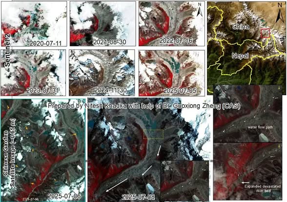 राष्ट्रिय विपद् जोखिम न्यूनीकरण तथा व्यवस्थापन प्राधिकरणले बुधबार पत्रकार सम्मेलन गरी बाढीको कारणबारे प्रारम्भिक निष्कर्ष सार्वजनिक गरेको हो। प्राधिकरणका कार्यकारी प्रमुख दिनेश भट्टले यो सामान्य वर्षाको बाढी नभई हिमताल विस्फोट नै भएको बताउनुभयो। बाढी ह्वात्तै आएर नदीको उचाइ एकै पटक साढे ३ मिटर बढेको छ, जुन सामान्य वर्षाले सम्भव छैन, उहाँले भन्नुभयो, उपग्रह तस्बिरको विश्लेषण गर्दा चीनतर्फको लेन्दे नदीभन्दा माथिको भागमा रहेका हिमतालहरू फुटेर बाढी आएको देखिन्छ। यसको मूल कारण जलवायु परिवर्तन हो।