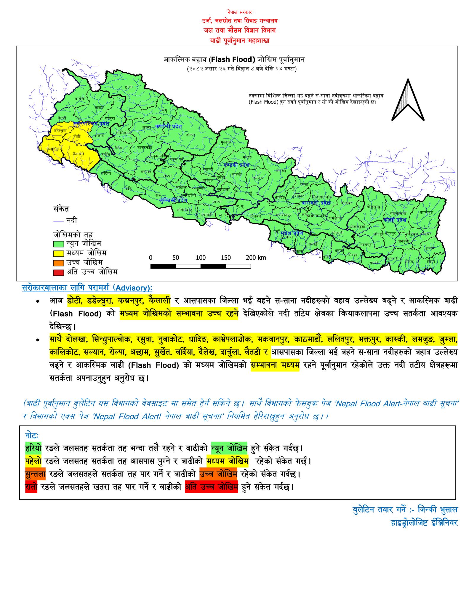 काठमाडौं, २६ अषाढ । जल तथा मौसम विज्ञान विभाग, मौसम पूर्वानुमान महाशाखाले आज बिहीबार देशका विभिन्न भागमा मनसुन सक्रिय रहने जनाएको छ । महाशाखाका अनुसार कोशी, बाग्मती, लुम्बिनी र सुदूरपश्चिम प्रदेशका एक–दुई स्थानमा आज राति भारी वर्षा हुने पूर्वानुमान छ । दिउँसोको समयमा हल्कादेखि मध्यम वर्षाको सम्भावना रहे पनि रातको समयमा वर्षाको मात्रा बढ्ने अनुमान गरिएको हो । महाशाखाले जारी गरेको विशेष बुलेटिन अनुसार, भारी वर्षासँगै उच्च पहाडी तथा हिमाली भूभागका केही स्थानमा हल्कादेखि मध्यम हिमपातको समेत सम्भावना छ । वर्षाका कारण बाढी, पहिरो तथा गेग्रान बहावको जोखिम उच्च रहने हुँदा सतर्कता अपनाउन आग्रह गरिएको छ । विशेषगरी ठूला तथा साना नदीनाला र खोलाहरूमा पानीको सतह बढ्न सक्ने, शहरी तथा तराईका होचा भू भागमा डुबान हुनसक्ने भएकाले ती क्षेत्रका सर्वसाधारणलाई सावधान रहन भनिएको छ । यसले दैनिक जनजीवन, कृषि, स्वास्थ्य, पर्यटन, र यातायात ९सडक तथा हवाई० क्षेत्रमा समेत प्रभाव पार्न सक्ने भन्दै पूर्वतयारीमा रहन सर्वसाधारण तथा सम्बन्धित सबै निकायलाई विशेष अनुरोध गरिएको छ । महाशाखाले आकस्मिक बाढीको जोखिमलाई मध्यनजर गर्दै केही जिल्लाहरूलाई विशेष निगरानीमा राखेको छ । सुदूरपश्चिमका डोटी, डडेलधुरा, कञ्चनपुर र कैलाली जिल्ला भई बहने साना नदीहरूमा आकस्मिक बाढीको उच्च मध्यम जोखिम रहेको औंल्याइएको छ । दोलखा, सिन्धुपाल्चोक, रसुवा, नुवाकोट, धादिङ, काभ्रेपलाञ्चोक, मकवानपुर, काठमाडौं, ललितपुर, भक्तपुर, कास्की, लमजुङ, जुम्ला, कालीकोट, सल्यान, रोल्पा, अछाम, सुर्खेत, बर्दिया, दैलेख, दार्चुला र बैतडी भई बहने साना नदीमा पनि बहाव उल्लेख्य बढ्ने हुँदा आकस्मिक बाढीको मध्यम जोखिम रहेको छ ।