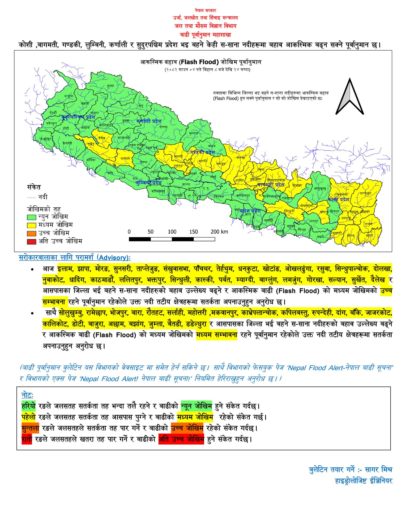 यसैगरी सुनसरीको धरान, तरहरा, इलामका चियाबगान क्षेत्र, लमजुङका बुझुङ र खुदीबजार तथा पर्वतको पञ्चासेमा पनि भारी वर्षा भएको छ । मधेश र बागमती प्रदेशका जिल्लाहरूमा भने हल्कादेखि मध्यम वर्षा भएको छ । बाढी पूर्वानुमान महाशाखाका अनुसार आज बिहान इलामको कन्काई र कोशीको सहायक नदी तमोरको जलसतह सतर्कता तह आसपास पुगेको छ । कन्काई नदी बढ्दो क्रममा रहेकाले दिउँसोसम्म तटीय क्षेत्र र डुबान हुने होचा भूभागमा उच्च सतर्कता अपनाउन महाशाखाले अनुरोध गरेको छ । पर्वतको मोदी खोलामा पनि बाढी आएको छ । यद्यपि, नारायणी, कर्णाली, महाकाली, कमला, बागमती, राप्ती र बबई जस्ता ठूला नदीहरूको बहाव हाल सतर्कता तहभन्दा तलै रहेको छ । महाशाखाले आज र भोलि देशका विभिन्न जिल्ला भएर बहने साना नदीहरूमा आकस्मिक बाढी आउन सक्ने चेतावनी दिएको छ जसमा इलाम, झापा, मोरङ, सुनसरी, ताप्लेजुङ, संखुवासभा, पाँचथर, धनकुटा, सिन्धुपाल्चोक, कास्की, पर्वत, म्याग्दी, बाग्लुङ, लमजुङ, गोरखा, सल्यान, सुर्खेत, दैलेख लगायतका जिल्ला रहेका छन् । यस्तै मध्यम जोखिममा सोलुखुम्बु, रामेछाप, मकवानपुर, काभ्रे, रुपन्देही, दाङ, बाँके, जाजरकोट, बाजुरा, अछाम, बैतडी, डडेल्धुरा लगायतका जिल्लारहेका छन् । कमजोर तथा भिरालो जमिनमा पहिरोको समेत जोखिम रहेकाले सतर्कता अपनाउन एसएमएसमार्फत सूचना प्रवाह गरिएको छ । यसैबीच, प्रधानमन्त्री केपी शर्मा ओलीले मौसम पूर्वानुमानको सूचनालाई ध्यान दिई आवश्यक सतर्कता अपनाउन सबैलाई आग्रह गर्नुभएको । साथै, प्रधानमन्त्रीले सुरक्षा निकायलाई उद्धार तथा राहतका लागि तयारी अवस्थामा रहन निर्देशन दिनुभएको छ ।