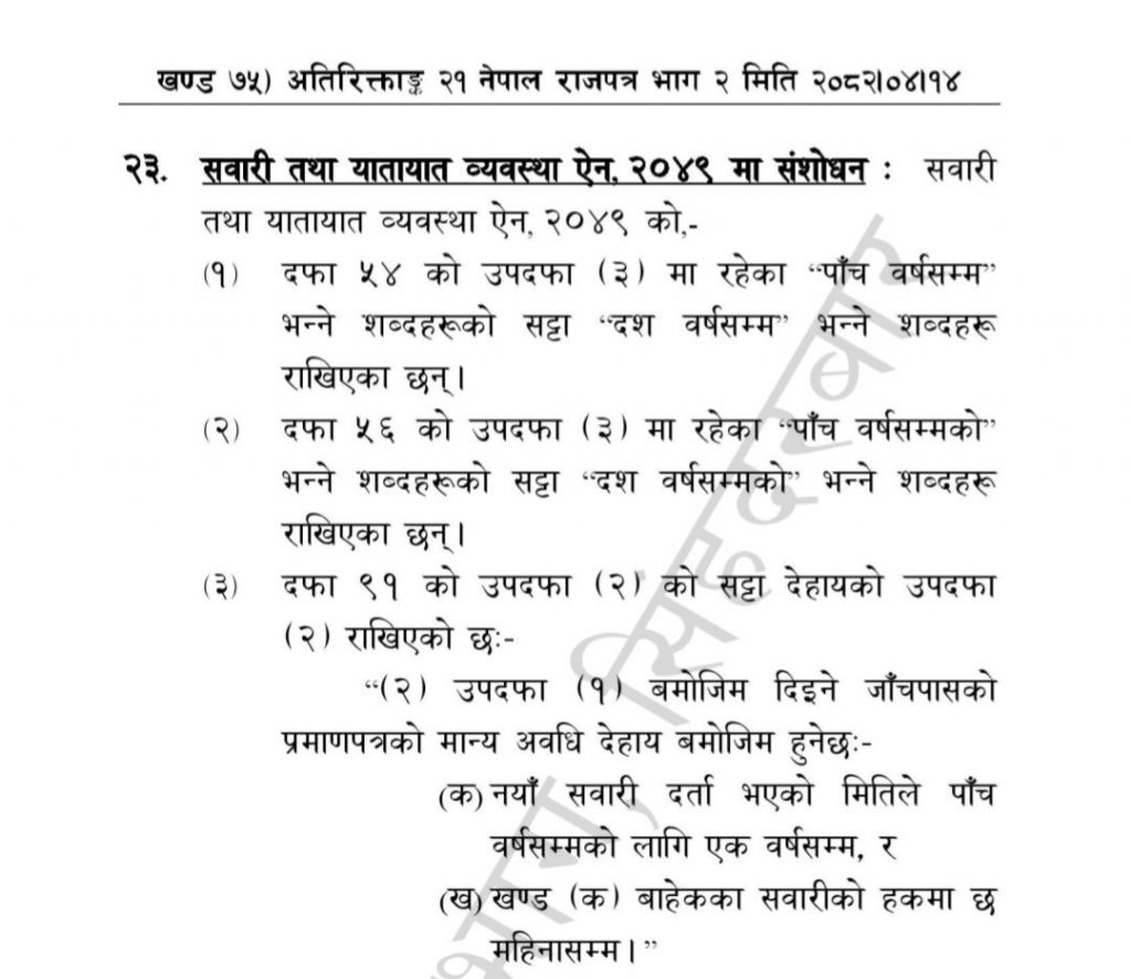 काठमाडौँ ,१६ श्रावण । नेपालमा सवारी चालक अनुमतिपत्र लाइसेन्सको अवधि अब दोब्बरले वृद्धि भई १० वर्ष पुगेको छ। सरकारले ‘केही नेपाल ऐन संशोधन’ मार्फत सवारी तथा यातायात व्यवस्था ऐन, २०४९ लाई परिवर्तन गरेसँगै यो नयाँ व्यवस्था लागू भएको हो। यस महत्वपूर्ण कदमले लाखौं सवारी चालकलाई प्रत्येक ५ वर्षमा नवीकरण गर्नुपर्ने झन्झटिलो प्रक्रियाबाट ठूलो राहत मिलेको छ। यसअघि सवारी तथा यातायात व्यवस्था ऐन, २०४९ अनुसार सवारी चालक अनुमतिपत्रको म्याद जारी भएको मितिले ५ वर्षसम्म मात्र कायम रहने व्यवस्था थियो। तर, नयाँ संशोधनसँगै अब लाइसेन्सको म्याद १० वर्षसम्म मान्य हुनेछ। यसले चालकहरूलाई बारम्बार यातायात कार्यालय धाउनुपर्ने, लामो लाइन बस्नुपर्ने र नवीकरणका लागि खर्च गर्नुपर्ने बाध्यताबाट मुक्ति दिनेछ। ऐन संशोधनमार्फत सवारी साधनको जाँचपास सवारीको प्राविधिक परीक्षणको प्रमाणपत्रको अवधिमा पनि नयाँ व्यवस्था गरिएको छ। ‘उक्त ऐनको दफा ५४ को उपदफा ३ मा रहेका पाँच वर्षसम्म भन्ने शब्दहरुको सट्टा दश वर्षसम्म भन्ने शब्दहरु राखिएका छन्’, राजपत्रमा प्रकाशित केही नेपाल ऐनलाई संशोधन गर्न बनेको ऐनको दफा २३ मा भनिएको छ, ‘दफा ५६ को उपदफा ३ मा रहेका पाँच वर्षसम्मको भन्ने शब्दहरुको सट्टा दश वर्षसम्मको भन्ने शब्दहरु राखिएका छन्।’ यो व्यवस्था अनुशार नयाँ सवारी साधनका लागि दर्ता भएको मितिदेखि पहिलो ५ वर्षसम्म, प्रत्येक एक एक वर्षमा जाँचपास गर्नुपर्नेछ, पुराना सवारी साधनका लागि ५ वर्षभन्दा पुराना प्रत्येक ६,६ महिनामा अनिवार्य रूपमा जाँचपास गर्नुपर्नेछ।