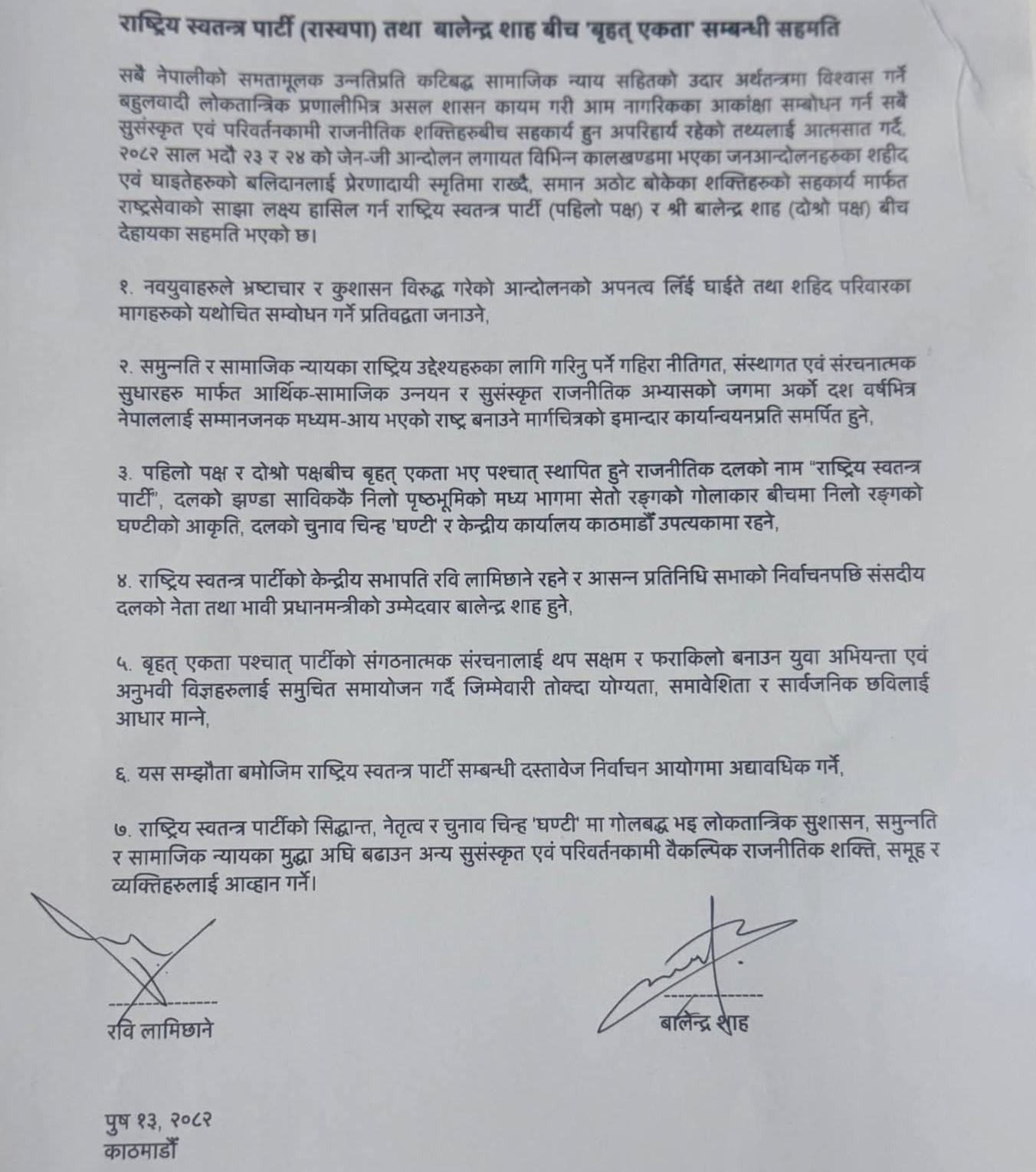 सबै नेपालीको समतामूलक उन्नतिप्रति कटिबद्ध सामाजिक न्यायसहितको उदार अर्थतन्त्रमा विश्वास गर्ने बहुलवादी लोकतान्त्रिक प्रणालीभित्र असल शासन कायम गरी आम नागरिकका आकांक्षा सम्बोधन गर्न सबै सुसंस्कृत एवं परिवर्तनकामी राजनीतिक शक्तिहरूबीच सहकार्य हुन अपरिहार्य रहेको तथ्यलाई आत्मसात् गर्दै, २०८२ साल भदौ २३ र २४ को जेनजी आन्दोलनलगायत विभिन्न कालखण्डमा भएका जनआन्दोलनहरूका सहिद एवं घाइतेहरूको बलिदानलाई प्रेरणादायी स्मृतिमा राख्दै, समान अठोट बोकेका शक्तिहरूको सहकार्यमार्फत राष्ट्रसेवाको साझा लक्ष्य हासिल गर्न राष्ट्रिय स्वतन्त्र पार्टी पहिलो पक्ष र श्री बालेन्द्र शाह दोस्रो पक्ष बीच देहायका सहमति भएको छ।