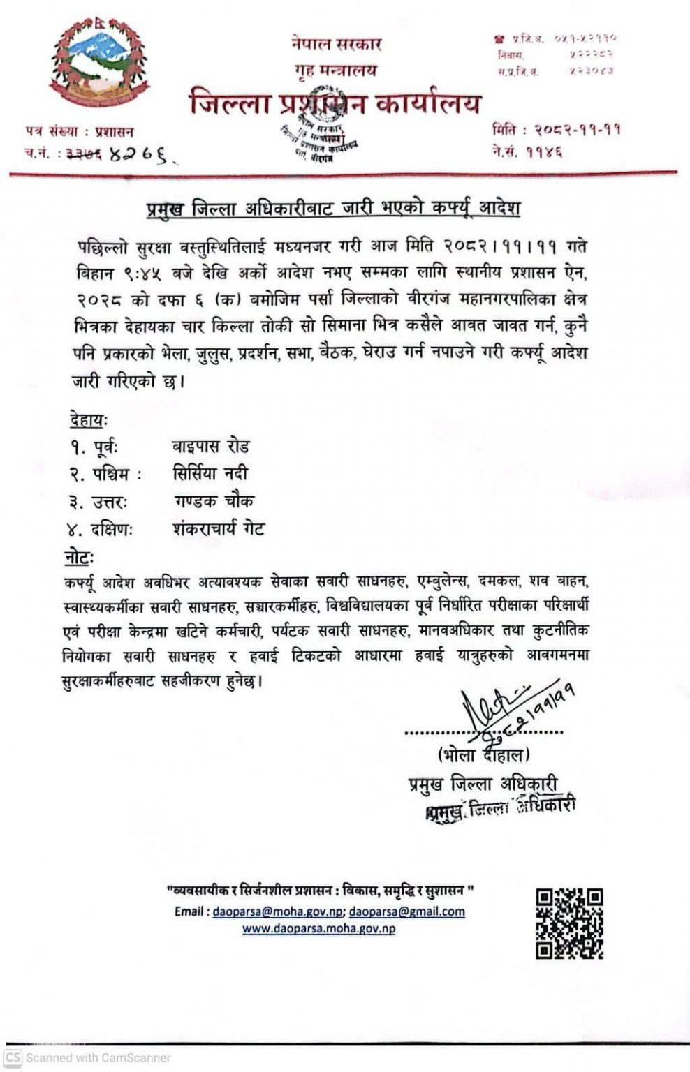 वीरगञ्ज, ११ फाल्गुन । पर्साको वीरगञ्ज महानगर क्षेत्रमा कर्फ्यू आदेश जारी भएको छ। प्रमुख जिल्ला अधिकारी भोला दाहालले सोमबार बिहान पौने १० बजेदेखि अर्को आदेश जारी नहुँदासम्म कर्फ्यू आदेश जारी गरेका हुन्। आइतबार वीरगन्ज क्षेत्रमा दुई समुदायबीच झडप भएको थियो। त्यस झडपले ठूलो रूप लिन सक्ने भन्दै प्रशासन कार्यालयले कर्फ्यू आदेश जारी गरेको हो। पूर्वमा बाइपास रोड, पश्चिममा सिर्सिया नदी, उत्तरमा गण्डक चोक र दक्षिणमा शंकराचार्य गेटसम्म सीमा तोकेको छ। यस अवधिमा कसले आवतजावत गर्न, कुनै पनि प्रकारको भेला, जुलुस, प्रदर्शन, सभा, बैठक नगर्न प्रशासनले अनुरोध गरेको छ। एम्बुलेन्स, दमकल, शव बाहन, स्वास्थ्यकर्मीका सवारीसाधन, सञ्चारकर्मीहरू, विश्वविद्यालयका पूर्व निर्धारित परीक्षाका परीक्षार्थी एवं कर्मचारी, पर्यटक सवारीसाधन, मानवअधिकार तथा कुटनीतिक नियोगका सवारीसाधन र हवाइ टिकटका आधारमा यात्रुहरूको आवागनका लागि सुरक्षाकर्मीले सहजीकरण गर्ने प्रशासनले जनाएको छ। उता जिल्ला प्रशासन कार्यालय रौतहटले कर्फ्यू आदेश हटाएको छ । जिल्ला सुरक्षा समितिको निर्णयअनुसार आज बिहान १० बजेदेखि लागू हुने गरी कर्फ्यू हटाइएको हो । प्रमुख जिल्ला अधिकारी दिनेशसागर भुसालद्वारा जारी सूचनामा यसअघि स्थानीय प्रशासन ऐन, २०२८ को दफा ६ क बमोजिम गौर नगरपालिकाको तोकिएको क्षेत्रमा जारी कफ्र्यु आदेश जिल्ला सुरक्षा समितिको बैठकको निर्णयअनुसार हटाइएको उल्लेख गरिएको छ। गत ७ गते दुई समुदायबीच झडप भएपछि रौतहट तनावग्रस्त बनेको थियो । प्रशासनले पछिल्लो सुरक्षा मूल्यांकनपछि अवस्था सामान्य बन्दै गएको निष्कर्ष निकाल्दै कर्फ्यू हटाइएको जनाएको छ ।