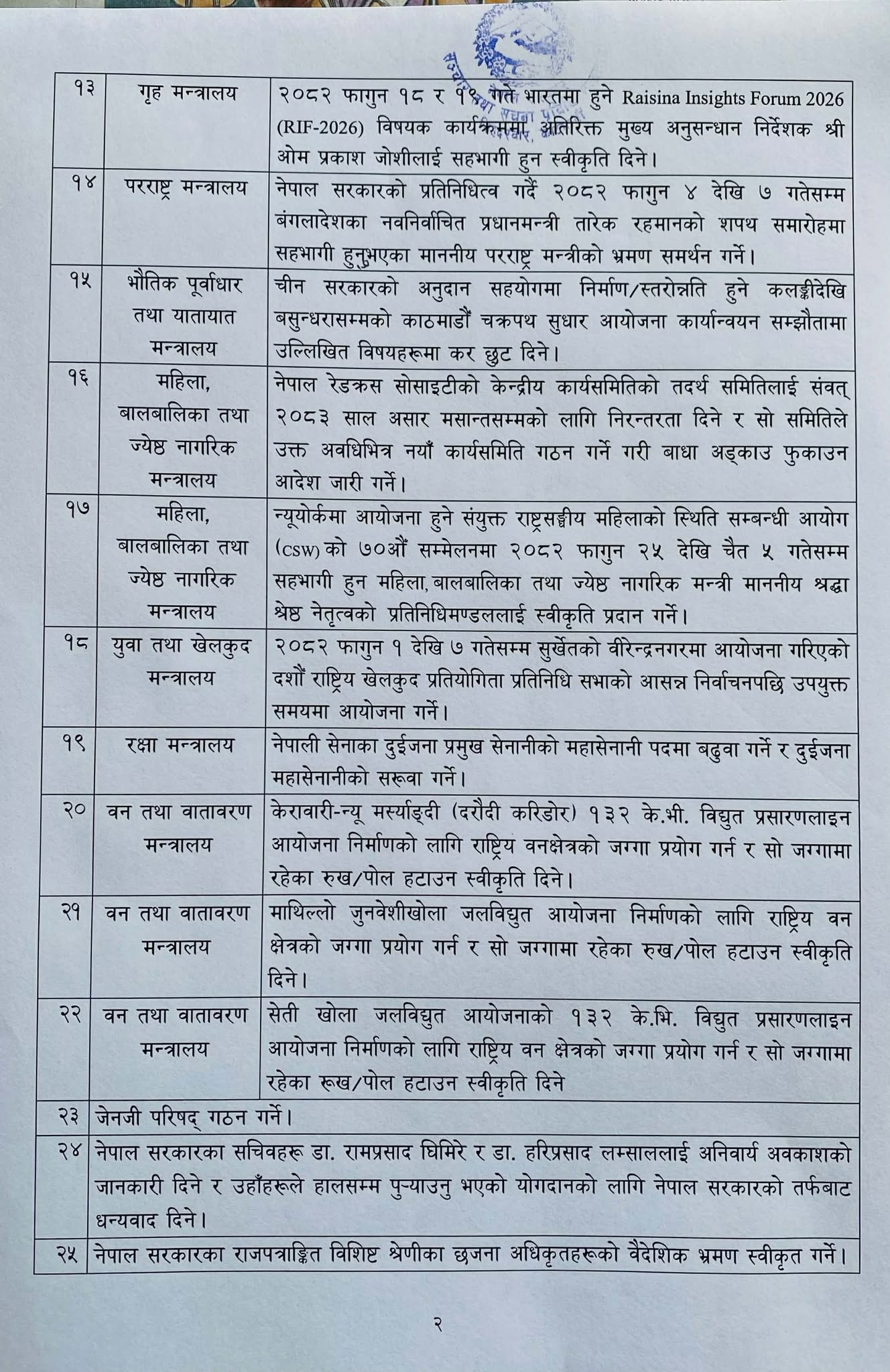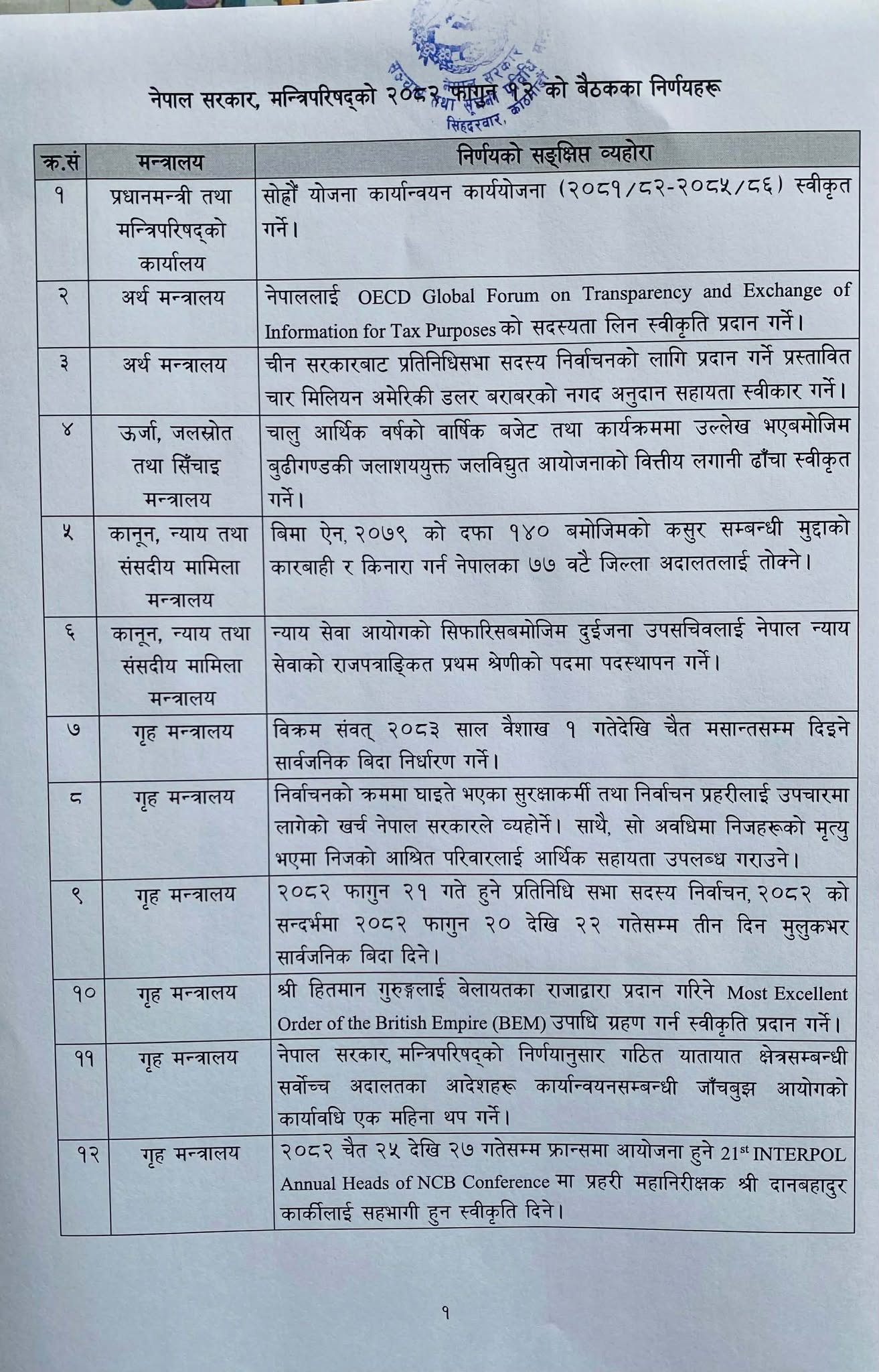 काठमाडौं, १३ फाल्गुन । आउँदो प्रतिनिधि सभाको निर्वाचनमा घाइते हुने सुरक्षाकर्मीको उपचार खर्च सरकारले बेहोर्ने भएको छ। घाइते सुरक्षाकर्मीको उपचार गर्ने मन्त्रिपरिषद्ले निर्णय गरेको सरकारका प्रवक्ता एवं गृहमन्त्री ओमप्रकाश अर्यालले जानकारी दिनु भएको छ। बुधबार सरकारको निर्णयबारे जानकारी दिँदै मन्त्री अर्यालले चुनावका क्रममा कुनै सुरक्षाकर्मीको मृत्यु भएका निजको आश्रित परिवारलाई क्षतिपूर्ति वापत आर्थिक सहायता उपलब्ध गराउने निर्णय पनि गरिएको बताउनुभयो । त्यसैगरी सरकारले यातायात क्षेत्रसम्बन्धी सर्वोच्च अदालतका आदेशहरू कार्यान्वयन सम्बन्धी जाँचबुझ आयोगको कार्य अवधि एक महिना थप गरेको छ। सरकारले १६औँ योजना कार्यांन्वयन कार्ययोजना पनि स्वीकृत गरेको उहाँले बताउनुभयो । सरकारले हितमान गुरुङलाई बेलायतका राजाद्वारा प्रदान गरिने बीइएम उपाधि ग्रहण गर्न स्विकृति प्रदान पनि गरेको छ। गृहमन्त्री ओमप्रकाश अर्यालले मंगलबारको मन्त्रिपरिषद् बैठकका निर्णय सार्वजनिक गर्नुभएको छ । सरकारले चुनावलाई मध्यनजर गर्दै फागुन २०,२१ र २२ गते सार्वजनिक बिदा दिने निर्णय गरेको छ । बैठकले बुढीगण्डकी जलाशययुक्त जलविद्युत् आयोजनाको वित्तीय लगानी ढाँचा स्वीकृत केरावारी न्यू मर्स्याङ्दी, माथिल्लो जुनवेशीखोला र सेती खोला जलविद्युत् आयोजना निर्माणका लागि राष्ट्रिय वन क्षेत्रको जग्गा प्रयोग गर्न र रुख हटाउन स्वीकृति दिने पनि निर्णय गरिएको छ । जेनजी परिषद् गठन गर्ने निर्णय पनि गरेको छ । यस्ता छन् मन्त्रिपरिषद्का निर्णयहरु