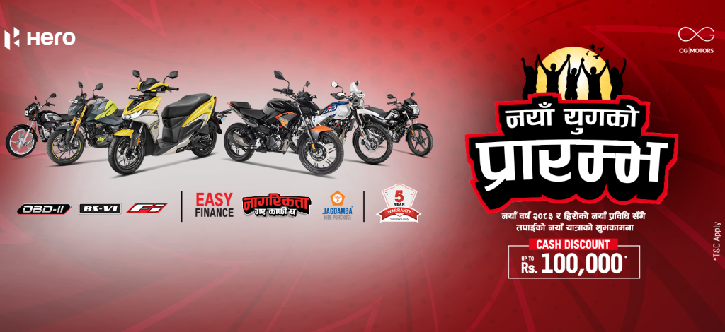 विराटनगर, २० चैत्र । नेपालकालागि हिरो ब्राण्डको मोटरसाईकलको आधिकारिक बिक्रेता सिजी मोटर्सले नयाँ बर्ष २०८३ लाई लक्षित गरेर ‘नयाँ युगको प्रारम्भ’ अफर ल्याएको छ ।यस्तै पुरानो मोटरसाईकल एक्सचेन्ज गर्दासमेत ग्राहकले ६ हजार रुपैयाँ अतिरिक्त मुल्याङ्कन पाउने कम्पनीको विराटनगर बिक्रेता लक्ष्मी ट्रेडिङ हाउस प्रा. लि. का सेल्स हेड प्रसन्नभक्त माथेमाले जानकारी दिए । यो अफर फाइनान्समासमेत लागू हुने कम्पनीले जानकारी दिएको छ । सहज फाइनान्समार्फत ग्राहकले बिना कुनै झन्झट नागरिकताकै भरमा मोटरसाईकल र स्कुटर खरिद गर्न सक्ने माथेमाले जानकारी दिए । स्कुटर र मोटरसाईकलको बजारमा सफल ब्राण्ड हिरो कम्पनीका स्प्लेण्डर प्लस, सुपर स्प्लेण्डर, एक्सट्रिम १२५, एक्सट्रिम १६०, एक्सपल्स मोटरसाईकल र जुम स्कुटर ग्राहकमाँझ लोकप्रिय छन् ।